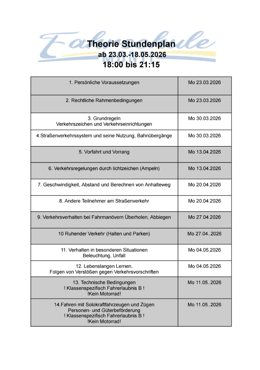 "Neugierig, was dich im Theorieunterricht erwartet? Hier ist unser aktueller Plan für den Grundstoff und die Klasse B!"